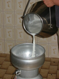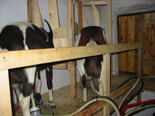 Wie wir Käse eigentlich hergestellt? Zunächst müssen die Ziegen gemolken werden. Dazu haben wir einen Melkstand wo immer zwei und zwei Ziegen mit eine Maschine gemolken werden können. Wichtig ist, dass dies sehr sauber gemacht wird und die Milch dann gleich abgekühlt wird. So verhindert man den unerwünschten "Geschmack" und die Milch bleibt neutral. |