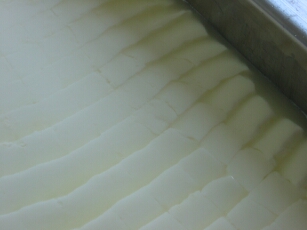 | Wenn die Milchsäurebakterien gut gewachsen sind, wird gelabt. Das heißt es kommt Lab dazu und die Milch wird dick, es entsteht eine galllertartige Masse. Diese muss dann in kleine Würfel geschnitten werden,damit die Molke austreten kann. | |||||
