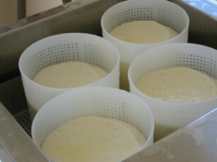 | Wenn diese Würfel fest geworden sind, kann der Käse abgefüllt werden. Je fester und kleiner diese Würfel umso fester wird auch der Käse. Nun kommt der Käse in die Formen und wird dann warmgehalten, damit die restliche Molke auch noch austreten kann. | |||||