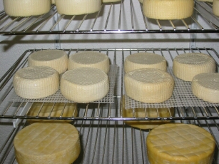 | Am nächsten Tag wird der Käse gesalzen. Damit erhält er eine schöne Rinde und auch der Geschmack wird damit beeinflußt. Dann geht es in den Reiferaum, wo der Käse je nach Sorte eine Woche bis mehrere Monate bleibt, bis er fertig gereift ist und verkauft werden kann | |||||